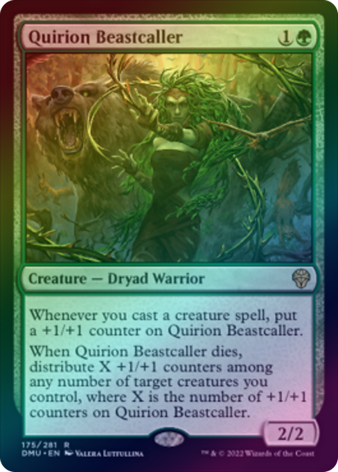Quirion BeastcallerCasting Cost: Card Type: Creature - Dryad WarriorPower/Toughness: 2/2Card Text: Whenever you cast a creature spell, put a +1/+1 counter on Quirion Beastcaller. When Quirion Beastcaller dies, distribute X +1/+1 counters among any number of target creatures you control, where X is the number of +1/+1 counters on Quirion Beastcaller.Artist: Valera Lutfullina
