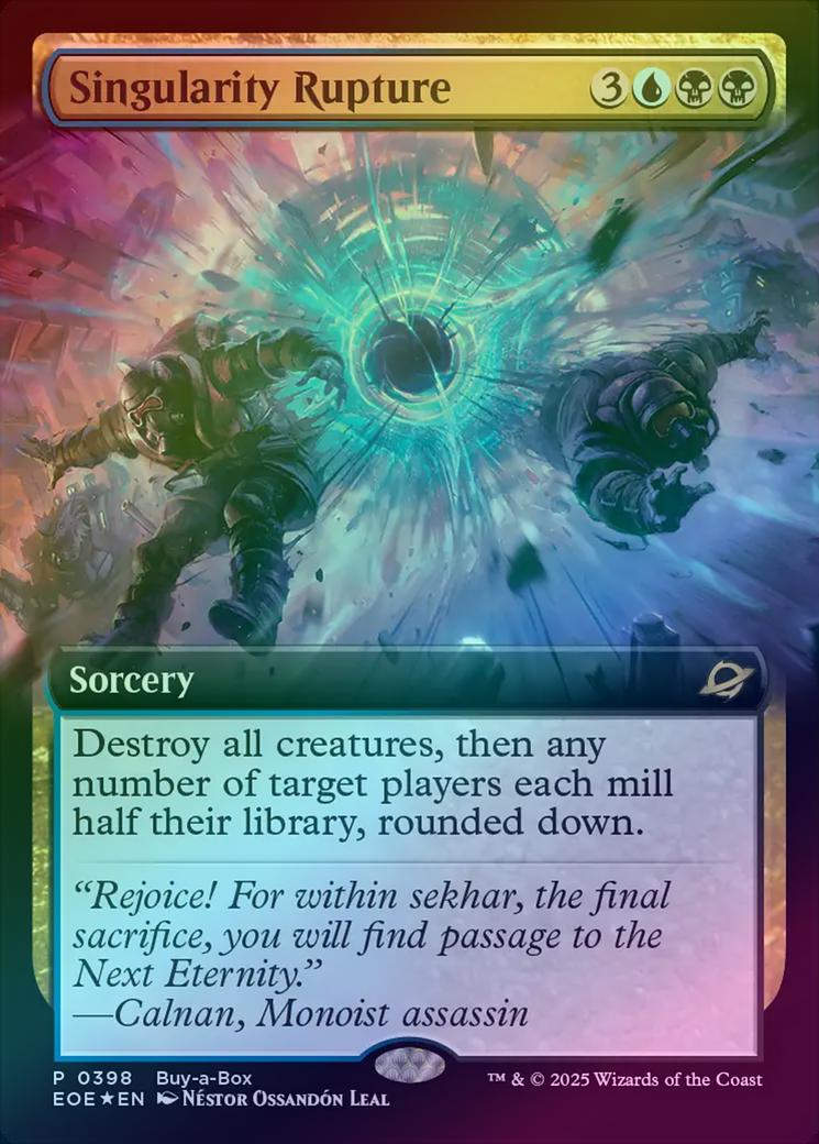Singularity RuptureCasting Cost: Card Type: SorceryCard Text: Destroy all creatures, then any number of target players each mill half their library, rounded down.Flavour Text: "Rejoice! For within sekhar, the final sacrifice, you will find passage to the Next Eternity." -Calnan, Monoist assassinArtist: Nstor Ossandn Leal