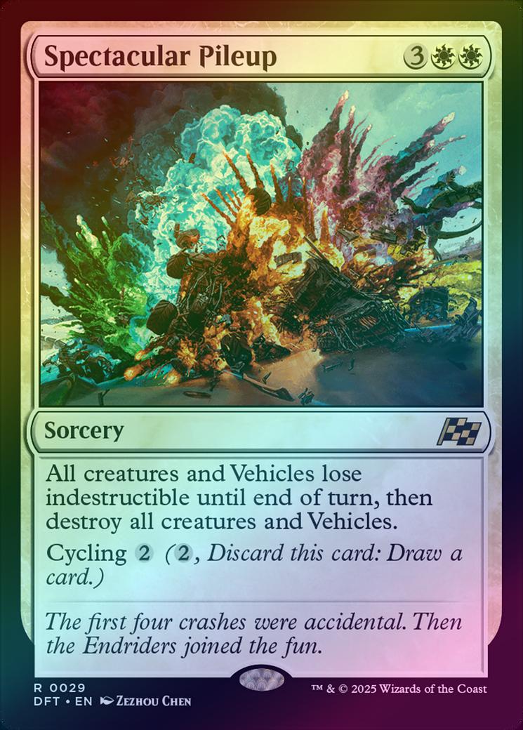 Spectacular PileupCasting Cost: Card Type: SorceryCard Text: All creatures and Vehicles lose indestructible until end of turn, then destroy all creatures and Vehicles. Cycling (, Discard this card: Draw a card.)Flavour Text: The first four crashes were accidental. Then the Endriders joined the fun.Artist: Zezhou Chen