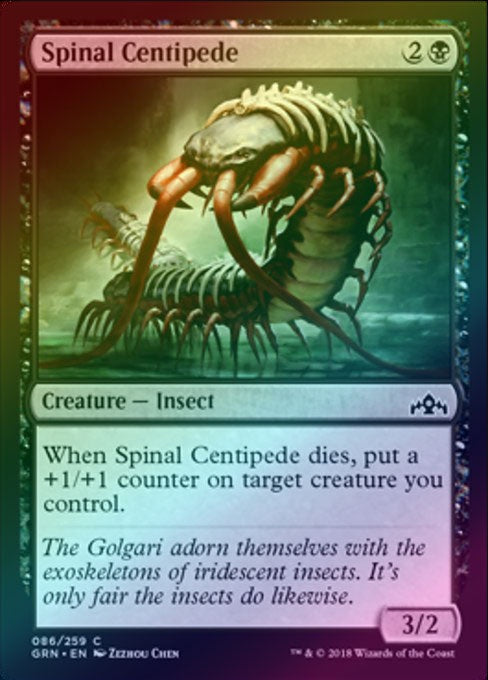 p>Spinal CentipedeCasting Cost: Card Type: Creature - InsectPower/Toughness: 3/2Card Text: When Spinal Centipede dies, put a +1/+1 counter on target creature you control.Flavour Text: The Golgari adorn themselves with the exoskeletons of iridescent insects. It's only fair the insects do likewise.Artist: Zezhou ChenRarity: Common