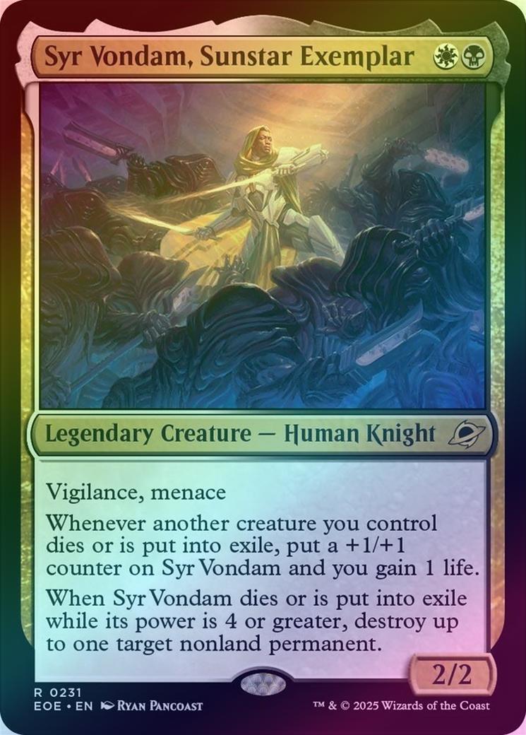 Syr Vondam, Sunstar ExemplarCasting Cost: Card Type: Legendary Creature - Human KnightPower/Toughness: 2/2Card Text: Vigilance, menace Whenever another creature you control dies or is put into exile, put a +1/+1 counter on Syr Vondam and you gain 1 life. When Syr Vondam dies or is put into exile while its power is 4 or greater, destroy up to one target nonland permanent.Artist: Ryan Pancoast