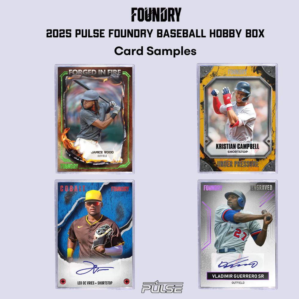 The 2025 Pulse Foundry Baseball series forges the future of the game—featuring elite prospects, iconic legends, and today’s top stars. Each box includes 6 premium cards, with 4 autographs per box, and every card numbered to 40 or less, sealed in a jewel case for ultimate display.