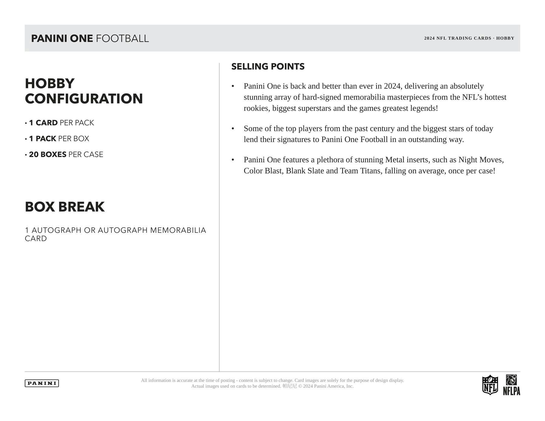 Panini One is back and better than ever in 2024, delivering an absolutely stunning array of hard-signed memorabilia masterpieces from the NFL's hottest rookies, biggest superstars, and the games greatest legends!