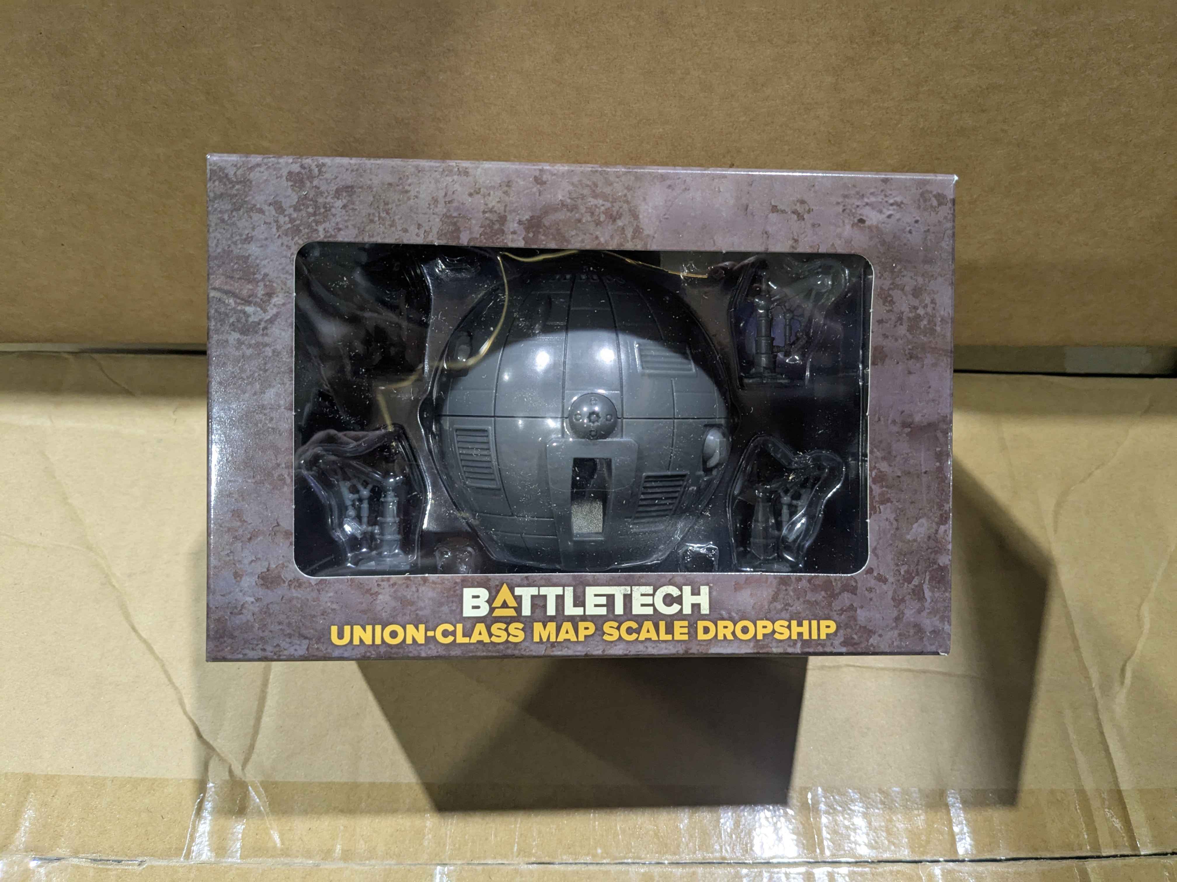 Replacing the resin DIY model kit offered in the Clan Invasion campaign is this (plastic) UNION map-scale DropShip. Detail levels are incredible. It measures approximately 3.6″ at the circumference, slightly smaller in volume than the resin kit in order to preserve scale difference with the OVERLORD class DropShip.