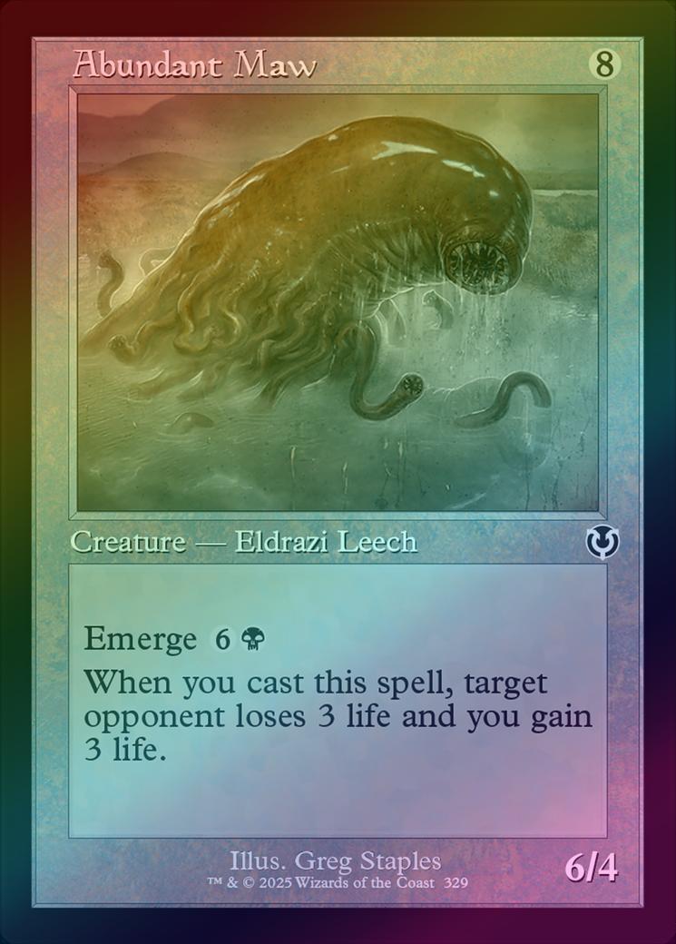 Abundant MawCasting Cost: Card Type: Creature - Eldrazi LeechPower/Toughness: 6/4Card Text: Emerge (You may cast this spell by sacrificing a creature and paying the emerge cost reduced by that creature's mana value.) When you cast this spell, target opponent loses 3 life and you gain 3 life.Artist: Greg Staples