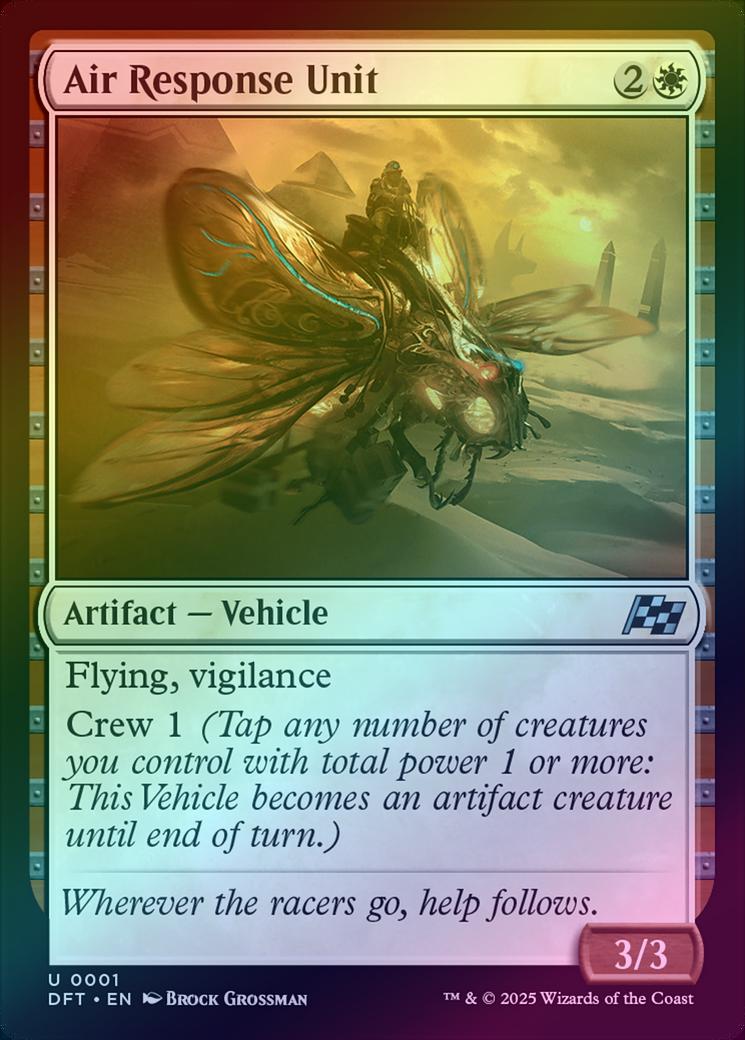 Air Response UnitCasting Cost: Card Type: Artifact - VehiclePower/Toughness: 3/3Card Text: Flying, vigilance Crew 1 (Tap any number of creatures you control with total power 1 or more: This Vehicle becomes an artifact creature until end of turn.)Flavour Text: Wherever the racers go, help follows.Artist: Brock Grossman