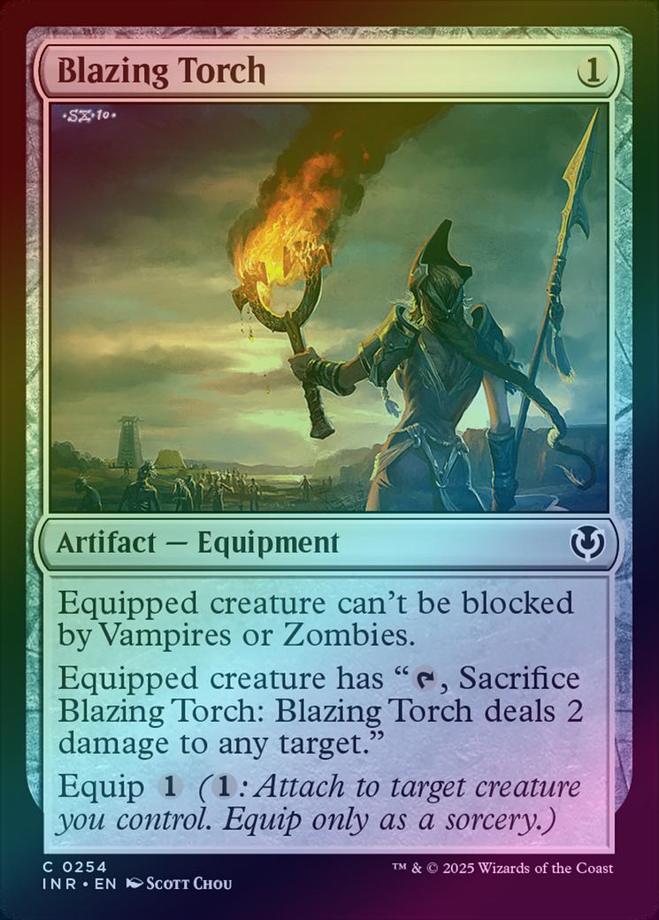 Blazing TorchCasting Cost: Card Type: Artifact - EquipmentCard Text: Equipped creature can't be blocked by Vampires or Zombies. Equipped creature has ", Sacrifice Blazing Torch: Blazing Torch deals 2 damage to any target." Equip (: Attach to target creature you control. Equip only as a sorcery.)Artist: Scott Chou