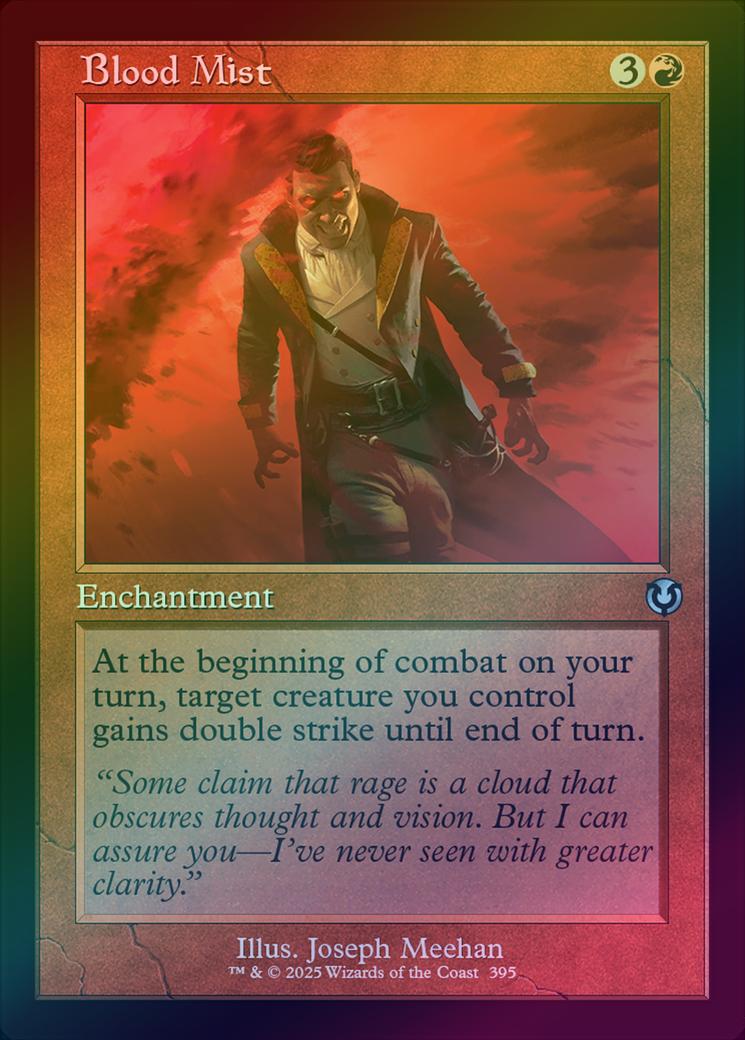 Blood MistCasting Cost: Card Type: EnchantmentCard Text: At the beginning of combat on your turn, target creature you control gains double strike until end of turn.Flavour Text: "Some claim that rage is a cloud that obscures thought and vision. But I can assure you-I've never seen with greater clarity."Artist: Joseph Meehan