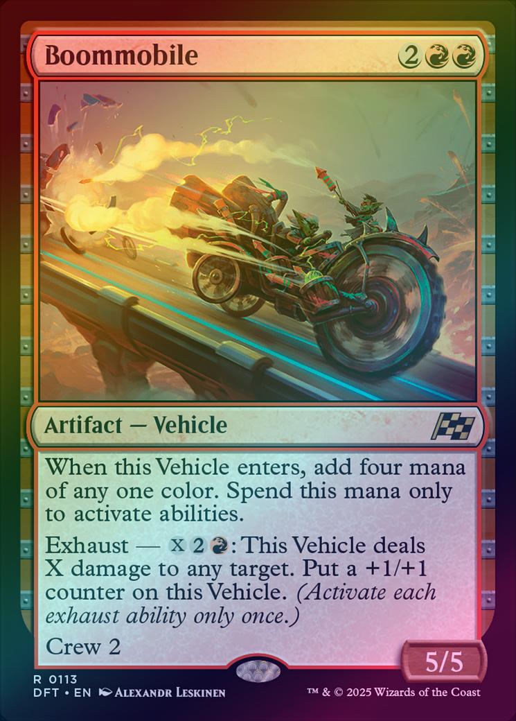 BoommobileCasting Cost: Card Type: Artifact - VehiclePower/Toughness: 5/5Card Text: When this Vehicle enters, add four mana of any one color. Spend this mana only to activate abilities. Exhaust - : This Vehicle deals X damage to any target. Put a +1/+1 counter on this Vehicle. (Activate each exhaust ability only once.) Crew 2Artist: Alexandr Leskinen