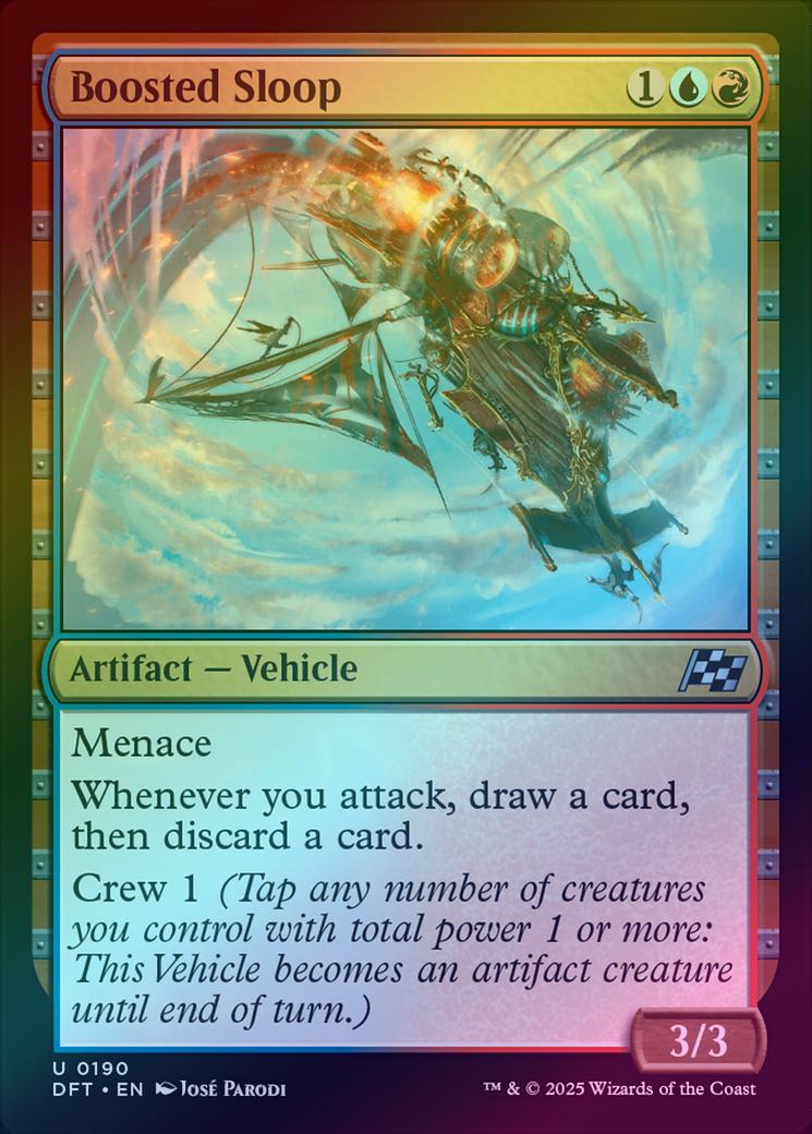Boosted SloopCasting Cost: Card Type: Artifact - VehiclePower/Toughness: 3/3Card Text: Menace Whenever you attack, draw a card, then discard a card. Crew 1 (Tap any number of creatures you control with total power 1 or more: This Vehicle becomes an artifact creature until end of turn.)Artist: Jos Parodi