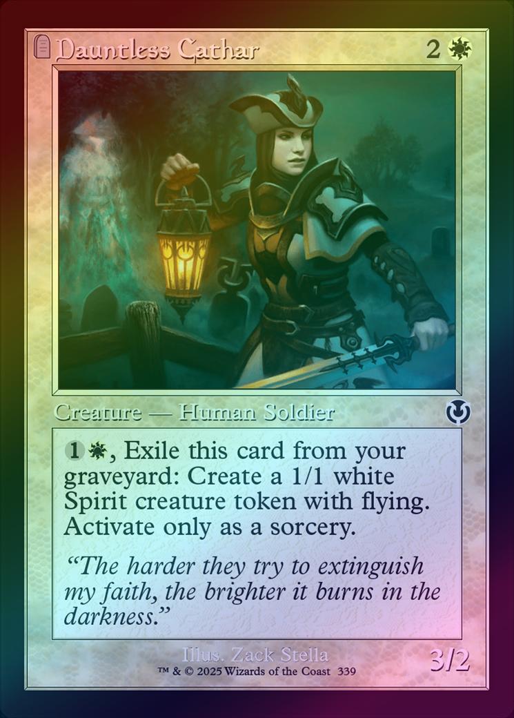Dauntless CatharCasting Cost: Card Type: Creature - Human SoldierPower/Toughness: 3/2Card Text: , Exile Dauntless Cathar from your graveyard: Create a 1/1 white Spirit creature token with flying. Activate only as a sorcery.Flavour Text: "The harder they try to extinguish my faith, the brighter it burns in the darkness."Artist: Zack Stella