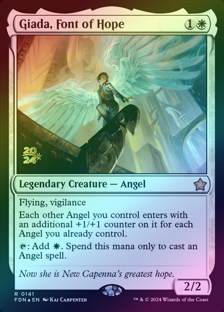 Giada, Font of HopeCasting Cost: Card Type: Legendary Creature - AngelPower/Toughness: 2/2Card Text: Flying, vigilance Each other Angel you control enters with an additional +1/+1 counter on it for each Angel you already control. : Add . Spend this mana only to cast an Angel spell.Flavour Text: Now she is New Capenna's greatest hope.Artist: Kai Carpenter