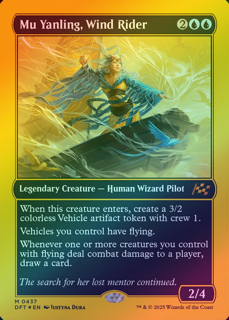 Mu Yanling, Wind RiderCasting Cost: Card Type: Legendary Creature - Human Wizard PilotPower/Toughness: 2/4Card Text: When this creature enters, create a 3/2 colorless Vehicle artifact token with crew 1. Vehicles you control have flying. Whenever one or more creatures you control with flying deal combat damage to a player, draw a card.Flavour Text: The search for her lost mentor continued.Artist: Justyna Dura