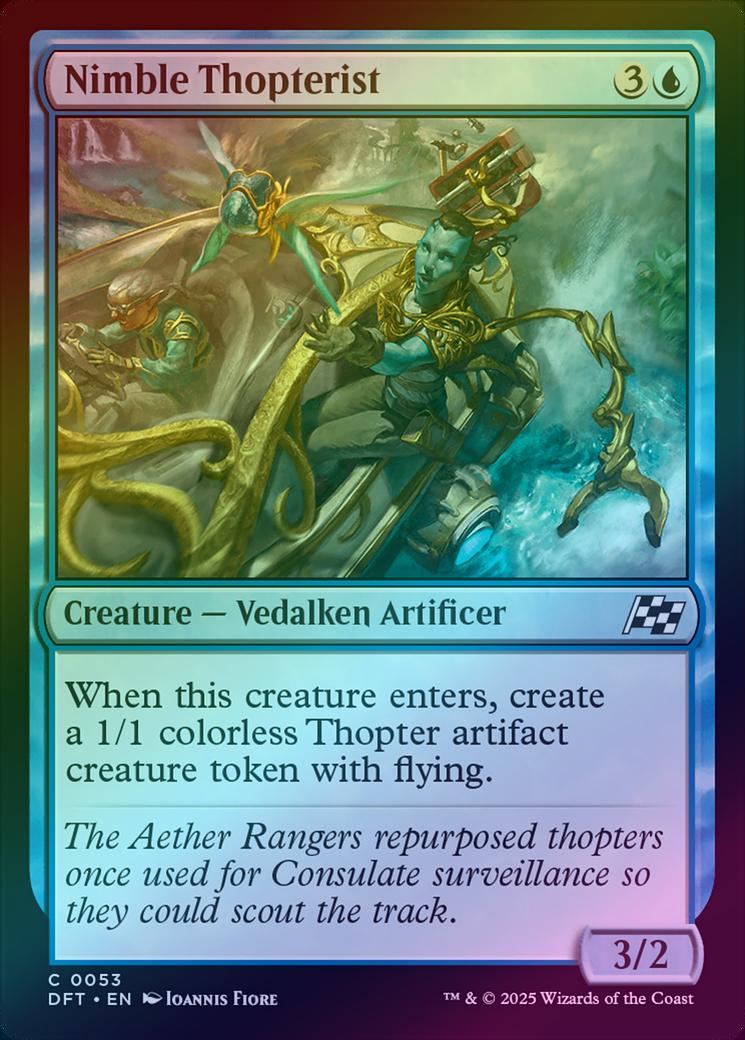 Nimble ThopteristCasting Cost: Card Type: Creature - Vedalken ArtificerPower/Toughness: 3/2Card Text: When this creature enters, create a 1/1 colorless Thopter artifact creature token with flying.Flavour Text: The Aether Rangers repurposed thopters once used for Consulate surveillance so they could scout the track.Artist: Ioannis Fiore