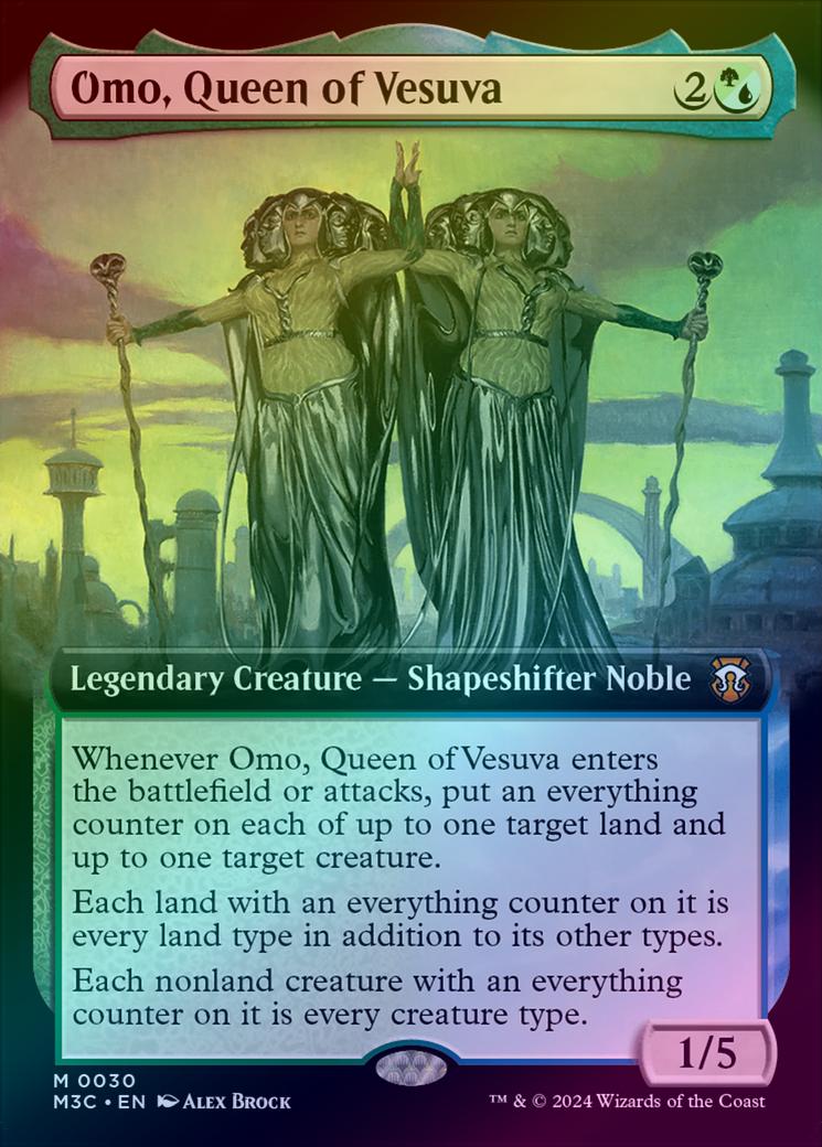 Omo, Queen of VesuvaCasting Cost: Card Type: Legendary Creature - Shapeshifter NoblePower/Toughness: 1/5Card Text: Whenever Omo, Queen of Vesuva enters the battlefield or attacks, put an everything counter on each of up to one target land and up to one target creature. Each land with an everything counter on it is every land type in addition to its other types. Each nonland creature with an everything counter on it is every creature type.Artist: Alex Brock