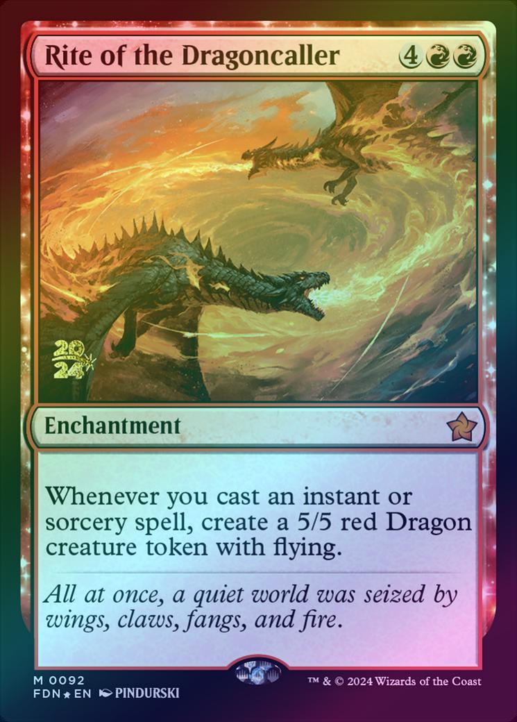 Rite of the DragoncallerCasting Cost: Card Type: EnchantmentCard Text: Whenever you cast an instant or sorcery spell, create a 5/5 red Dragon creature token with flying.Flavour Text: All at once, a quiet world was seized by wings, claws, fangs, and fire.Artist: PINDURSKI