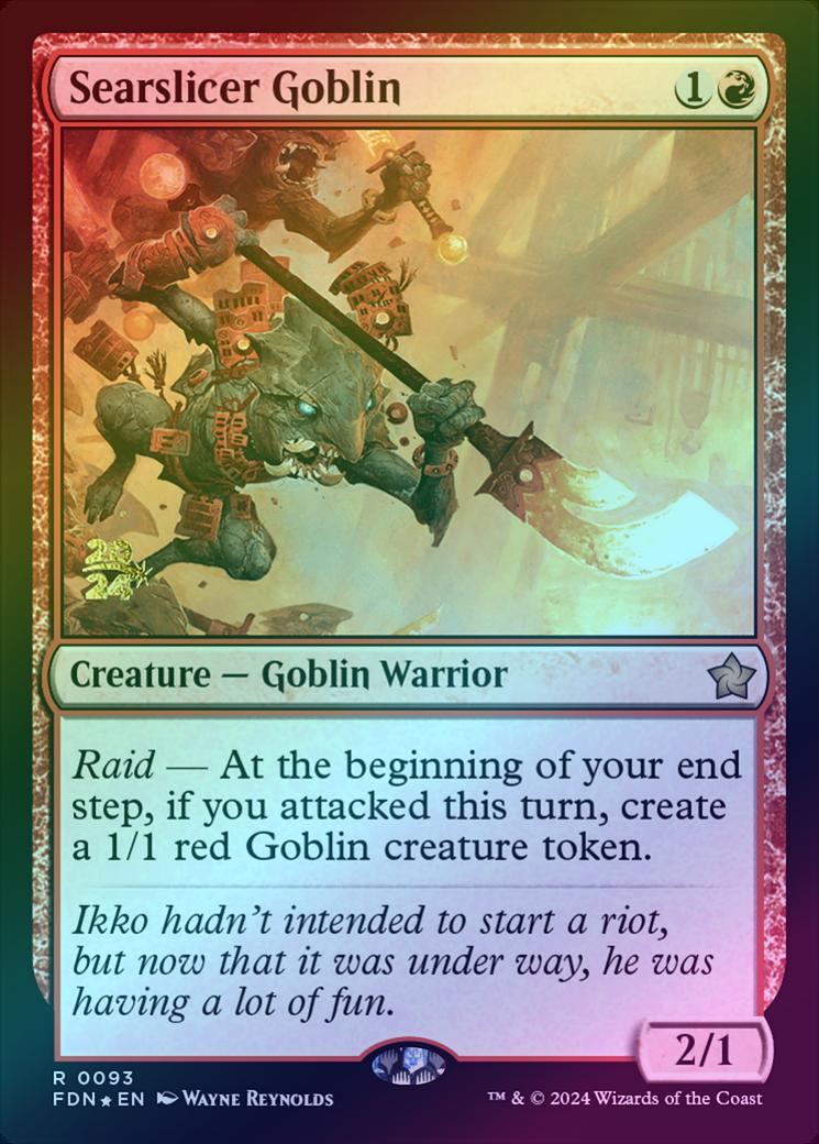 Searslicer GoblinCasting Cost: Card Type: Creature - Goblin WarriorPower/Toughness: 2/1Card Text: Raid - At the beginning of your end step, if you attacked this turn, create a 1/1 red Goblin creature token.Flavour Text: Ikko hadn't intended to start a riot, but now that it was under way, he was having a lot of fun.Artist: Wayne Reynolds