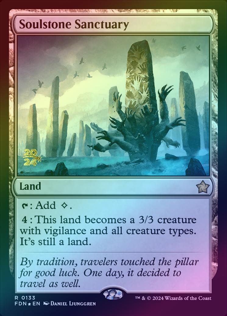 Soulstone SanctuaryCard Type: LandCard Text: : Add . : This land becomes a 3/3 creature with vigilance and all creature types. It's still a land.Flavour Text: By tradition, travelers touched the pillar for good luck. One day, it decided to travel as well.Artist: Daniel Ljunggren