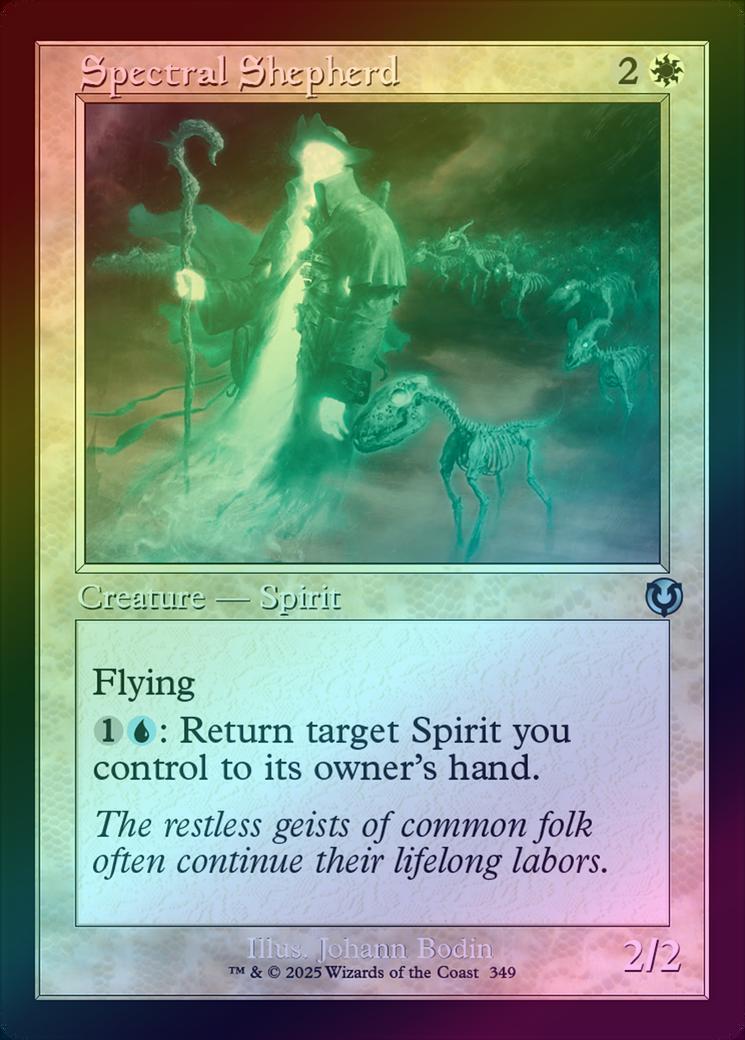 Spectral ShepherdCasting Cost: Card Type: Creature - SpiritPower/Toughness: 2/2Card Text: Flying : Return target Spirit you control to its owner's hand.Flavour Text: The restless geists of common folk often continue their lifelong labors.Artist: Johann Bodin