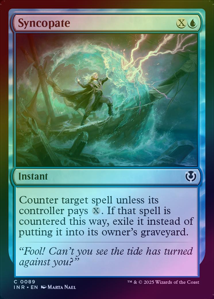 SyncopateCasting Cost: Card Type: InstantCard Text: Counter target spell unless its controller pays . If that spell is countered this way, exile it instead of putting it into its owner's graveyard.Flavour Text: "Fool! Can't you see the tide has turned against you?"Artist: Marta Nael