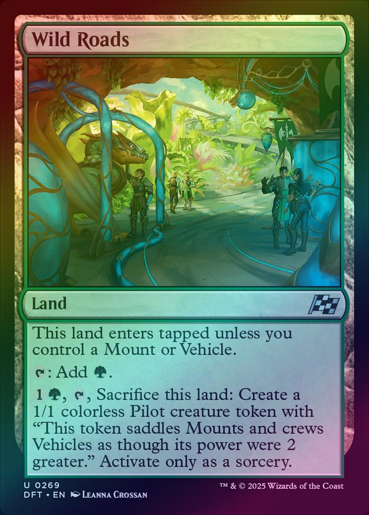 Wild RoadsCard Type: LandCard Text: This land enters tapped unless you control a Mount or Vehicle. : Add . , , Sacrifice this land: Create a 1/1 colorless Pilot creature token with "This token saddles Mounts and crews Vehicles as though its power were 2 greater." Activate only as a sorcery.Artist: Leanna Crossan