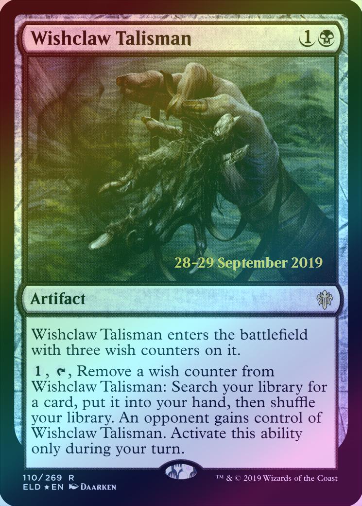 Wishclaw TalismanCasting Cost: Card Type: ArtifactCard Text: This artifact enters with three wish counters on it. , , Remove a wish counter from this artifact: Search your library for a card, put it into your hand, then shuffle. An opponent gains control of this artifact. Activate only during your turn.Artist: Daarken