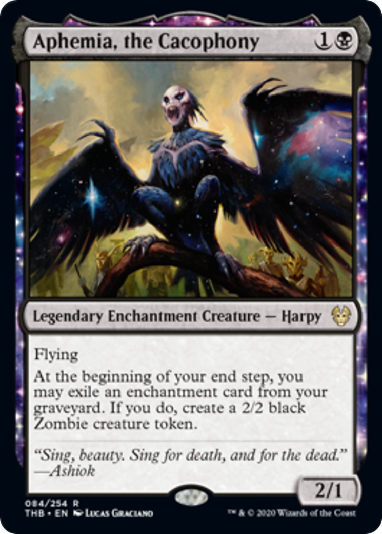 Aphemia, the CacophonyCasting Cost: Card Type: Legendary Enchantment Creature - HarpyPower/Toughness: 2/1Card Text: Flying At the beginning of your end step, you may exile an enchantment card from your graveyard. If you do, create a 2/2 black Zombie creature token.Flavour Text: "Sing, beauty. Sing for death, and for the dead." -AshiokArtist: Lucas GracianoRarity: Rare