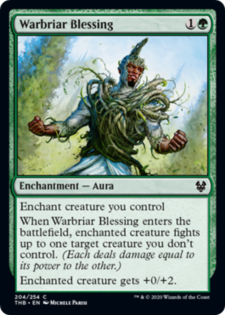 Warbriar BlessingCasting Cost: Card Type: Enchantment - AuraCard Text: Enchant creature you control When Warbriar Blessing enters the battlefield, enchanted creature fights up to one target creature you don't control. (Each deals damage equal to its power to the other.) Enchanted creature gets +0/+2.Artist: Rarity: Common