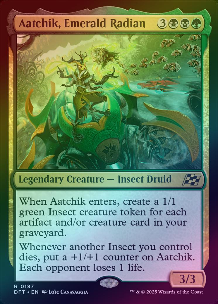 Aatchik, Emerald RadianCasting Cost: Card Type: Legendary Creature - Insect DruidPower/Toughness: 3/3Card Text: When Aatchik enters, create a 1/1 green Insect creature token for each artifact and/or creature card in your graveyard. Whenever another Insect you control dies, put a +1/+1 counter on Aatchik. Each opponent loses 1 life.Artist: Loc Canavaggia
