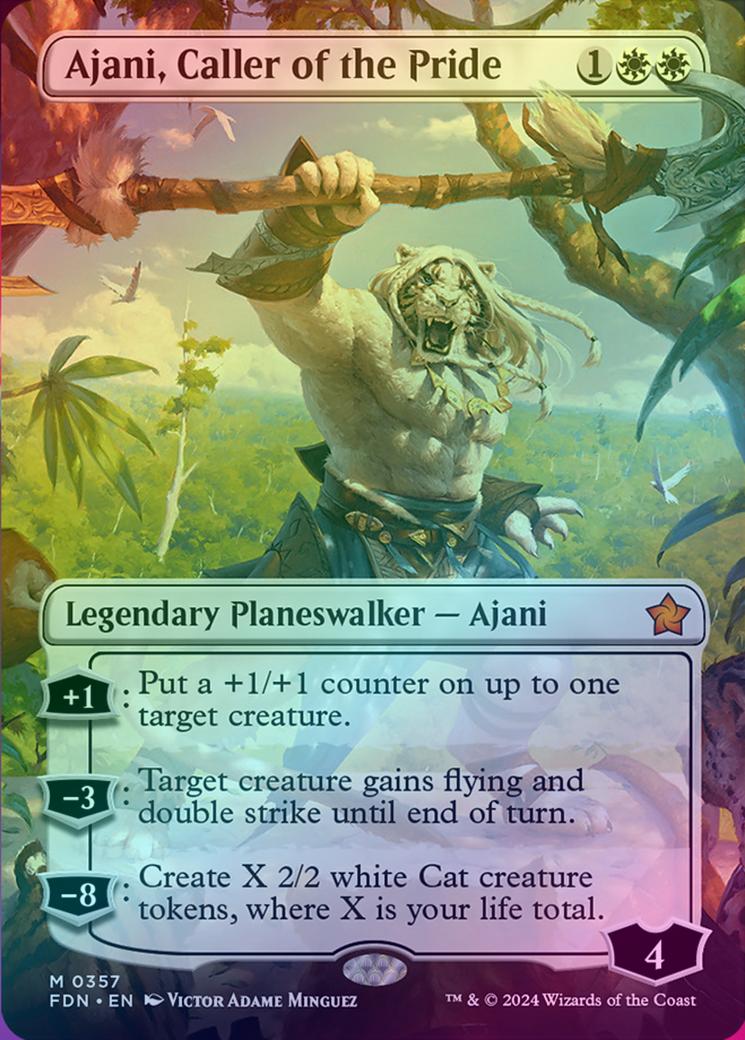 Ajani, Caller of the PrideCasting Cost: Card Type: Legendary Planeswalker - AjaniLoyalty: 4Card Text: +1: Put a +1/+1 counter on up to one target creature. -3: Target creature gains flying and double strike until end of turn. -8: Create X 2/2 white Cat creature tokens, where X is your life total.Artist: Victor Adame Minguez