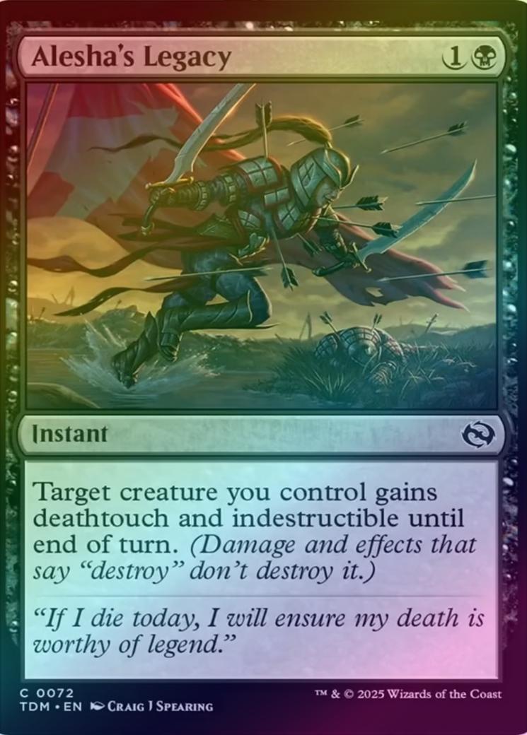 Alesha's LegacyCasting Cost: Card Type: InstantCard Text: Target creature you control gains deathtouch and indestructible until end of turn. (Damage and effects that say "destroy" don't destroy it.)Flavour Text: "If I die today, I will ensure my death is worthy of legend."Artist: Craig J Spearing