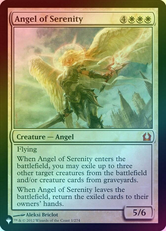 Angel of SerenityCasting Cost: Card Type: Creature - AngelPower/Toughness: 5/6Card Text: Flying When Angel of Serenity enters the battlefield, you may exile up to three other target creatures from the battlefield and/or creature cards from graveyards. When Angel of Serenity leaves the battlefield, return the exiled cards to their owners' hands.Artist: Aleksi Briclot