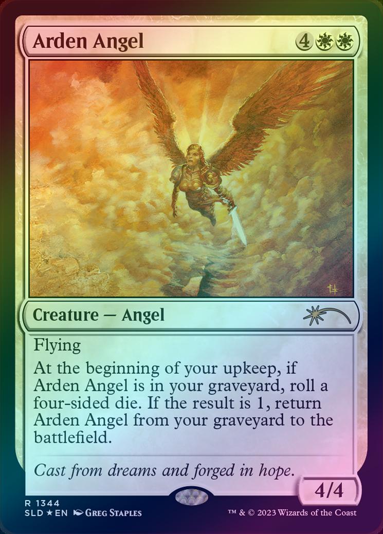Arden AngelCasting Cost: Card Type: Creature - AngelPower/Toughness: 4/4Card Text: Flying At the beginning of your upkeep, if Arden Angel is in your graveyard, roll a four-sided die. If the result is 1, return Arden Angel from your graveyard to the battlefield.Flavour Text: Cast from dreams and forged in hope.Artist: Greg Staples
