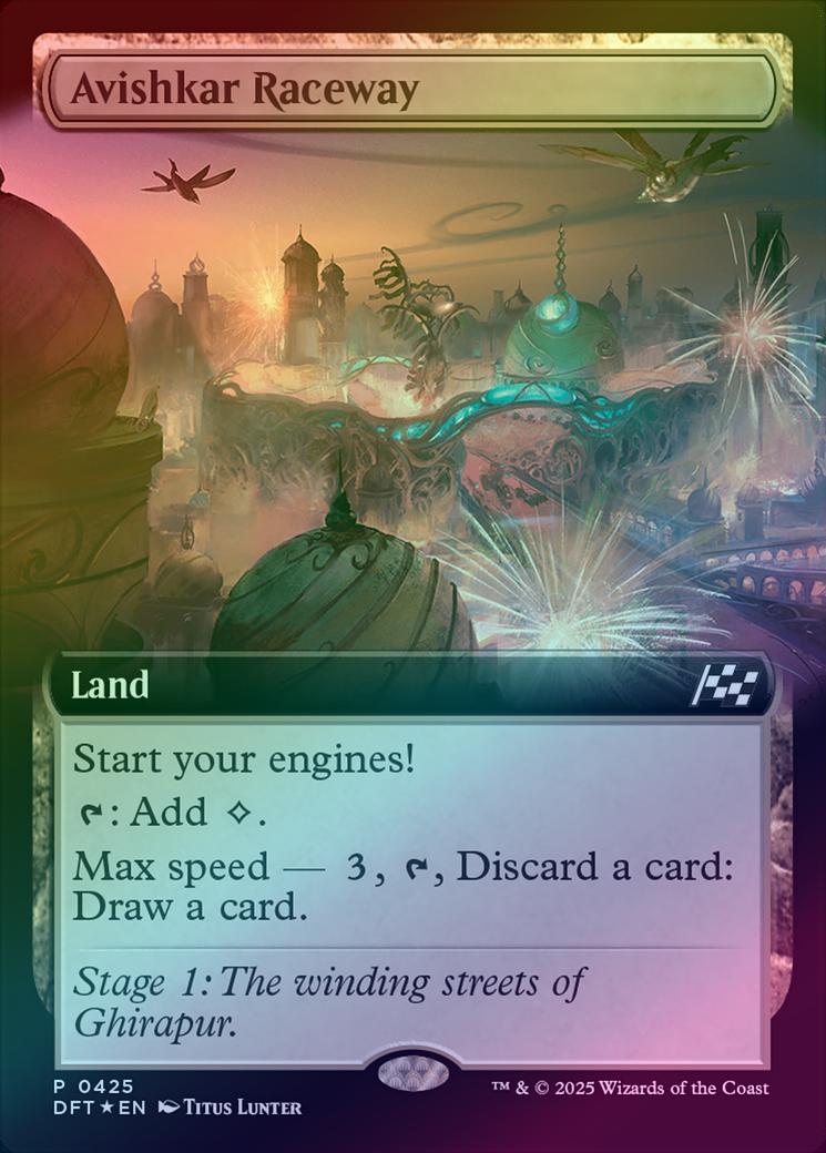Avishkar RacewayCard Type: LandCard Text: Start your engines! (If you have no speed, it starts at 1. It increases once on each of your turns when an opponent loses life. Max speed is 4.) : Add . Max speed - , , Discard a card: Draw a card.Flavour Text: Stage 1: The winding streets of Ghirapur.Artist: Titus Lunter