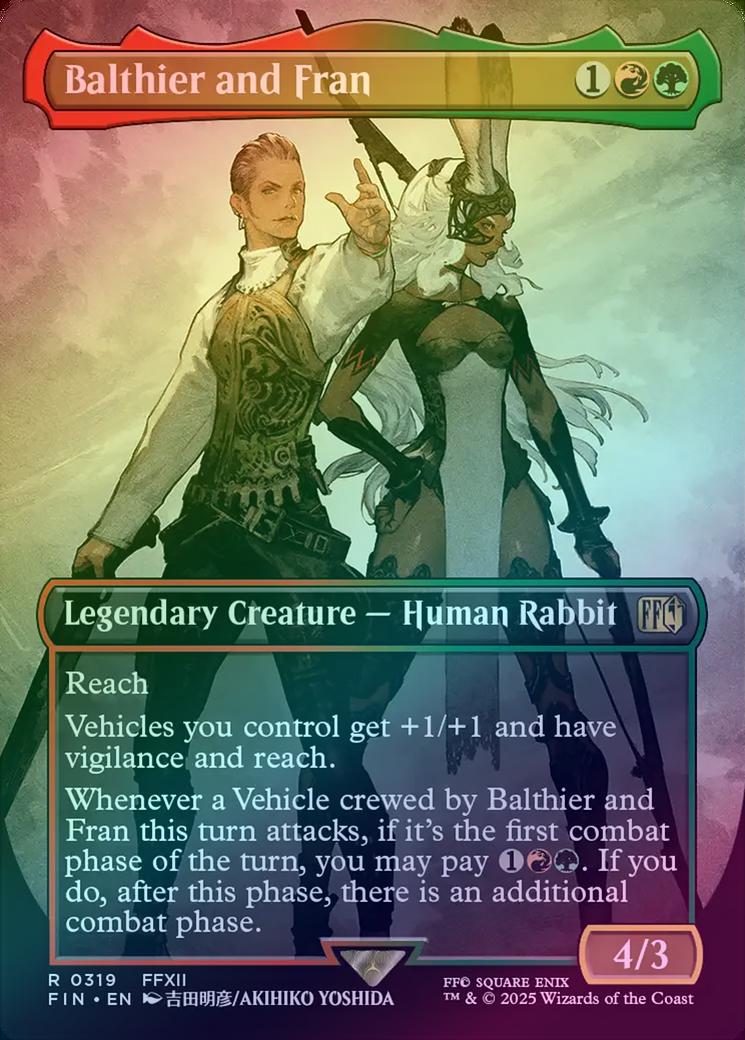 Balthier and FranCasting Cost: Card Type: Legendary Creature - Human RabbitPower/Toughness: 4/3Card Text: Reach Vehicles you control get +1/+1 and have vigilance and reach. Whenever a Vehicle crewed by Balthier and Fran this turn attacks, if it's the first combat phase of the turn, you may pay . If you do, after this phase, there is an additional combat phase.Artist: Akihiko Yoshida