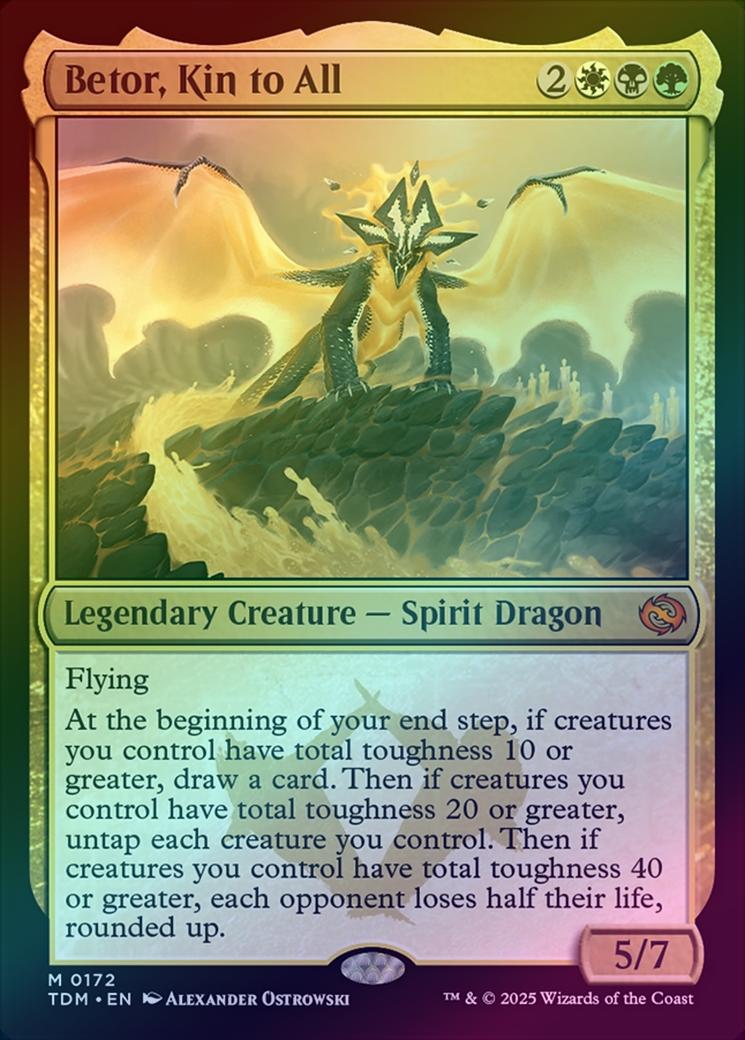 Betor, Kin to AllCasting Cost: Card Type: Legendary Creature - Spirit DragonPower/Toughness: 5/7Card Text: Flying At the beginning of your end step, if creatures you control have total toughness 10 or greater, draw a card. Then if creatures you control have total toughness 20 or greater, untap each creature you control. Then if creatures you control have total toughness 40 or greater, each opponent loses half their life, rounded up.Artist: Alexander Ostrowski