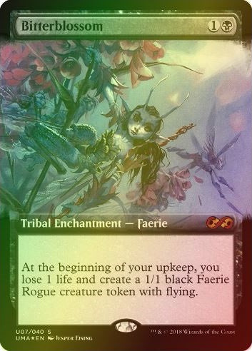 BitterblossomCasting Cost: Card Type: Tribal Enchantment - FaerieCard Text: At the beginning of your upkeep, you lose 1 life and create a 1/1 black Faerie Rogue creature token with flying.Flavour Text: In Lorwyn's brief evenings, the sun pauses at the horizon long enough for a certain species of violet to bloom with the fragrance of mischief.Artist: Jesper EjsingRarity: Mythic