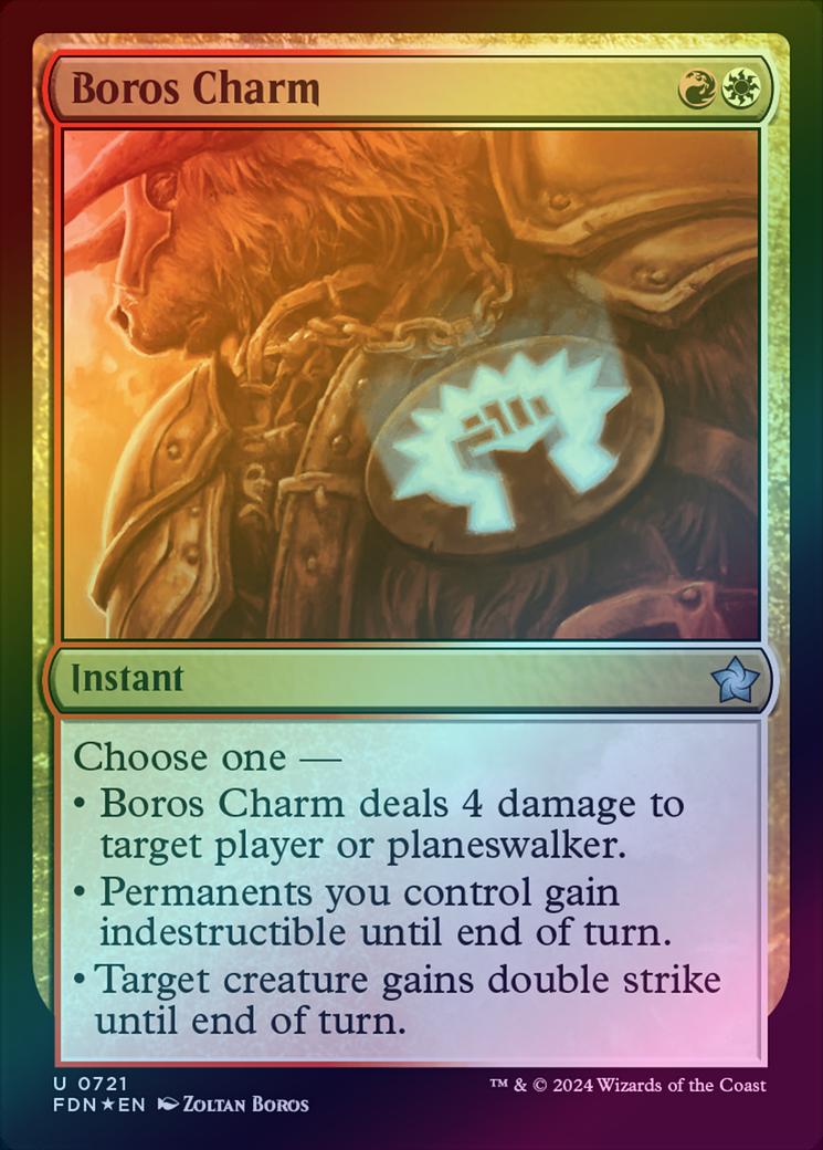 Boros CharmCasting Cost: Card Type: InstantCard Text: Choose one - - Boros Charm deals 4 damage to target player or planeswalker. - Permanents you control gain indestructible until end of turn. - Target creature gains double strike until end of turn.Artist: Zoltan Boros