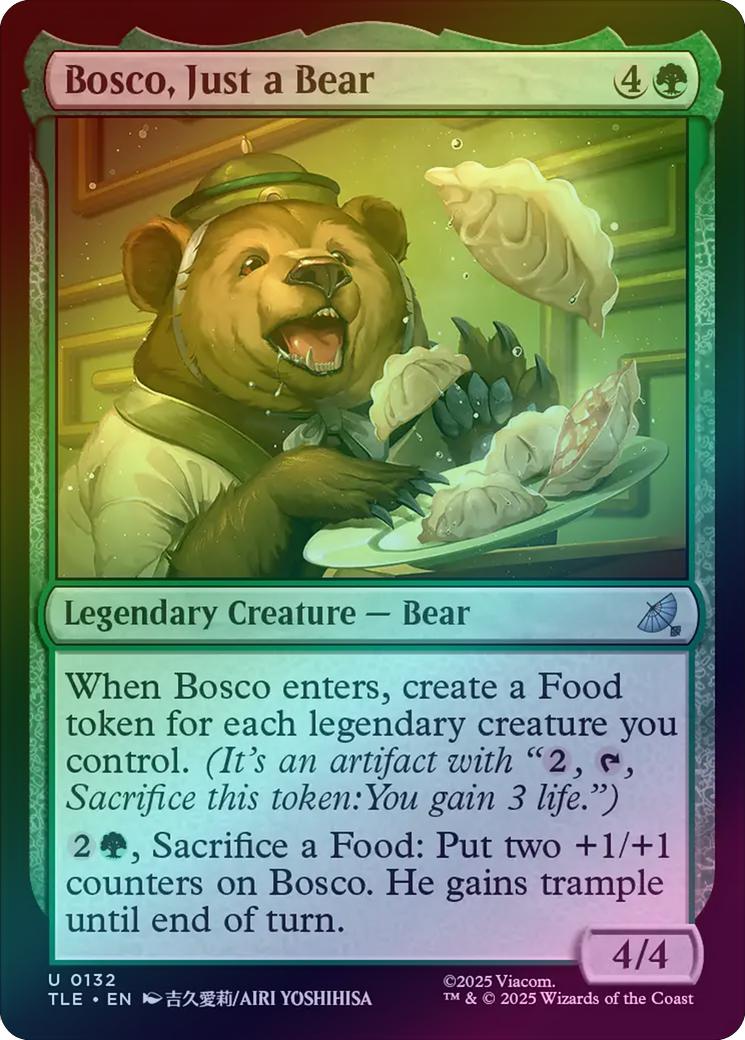Bosco, Just a BearCasting Cost: Card Type: Legendary Creature - BearPower/Toughness: 4/4Card Text: When Bosco enters, create a Food token for each legendary creature you control. (It's an artifact with ", , Sacrifice this token: You gain 3 life.") , Sacrifice a Food: Put two +1/+1 counters on Bosco. He gains trample until end of turn.Artist: Airi Yoshihisa