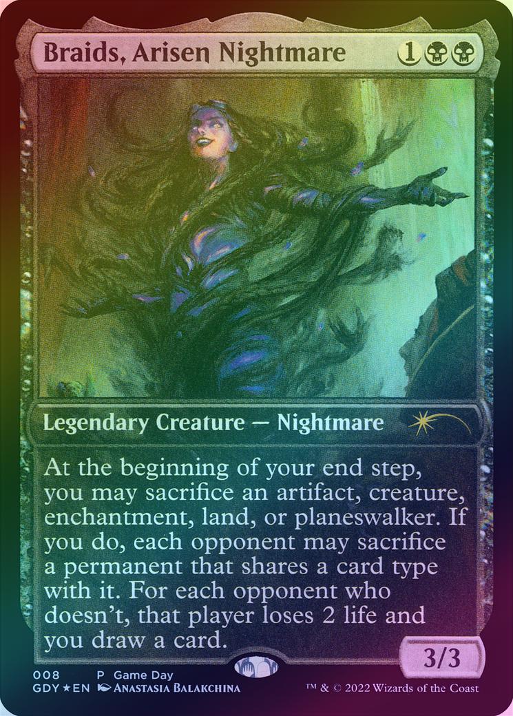 Braids, Arisen NightmareCasting Cost: Card Type: Legendary Creature - NightmarePower/Toughness: 3/3Card Text: At the beginning of your end step, you may sacrifice an artifact, creature, enchantment, land, or planeswalker. If you do, each opponent may sacrifice a permanent of their choice that shares a card type with it. For each opponent who doesn't, that player loses 2 life and you draw a card.Artist: Anastasia Balakchina