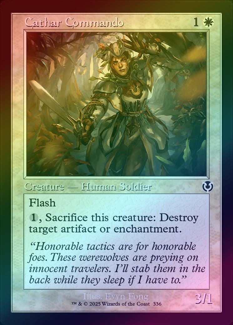Cathar CommandoCasting Cost: Card Type: Creature - Human SoldierPower/Toughness: 3/1Card Text: Flash (You may cast this spell any time you could cast an instant.) , Sacrifice this creature: Destroy target artifact or enchantment.Flavour Text: "Honorable tactics are for honorable foes. These werewolves are preying on innocent travelers. I'll stab them in the back while they sleep if I have to."Artist: Evyn Fong