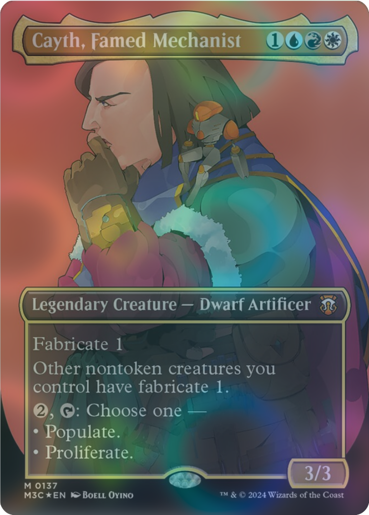 Cayth, Famed MechanistCasting Cost: Card Type: Legendary Creature - Dwarf ArtificerPower/Toughness: 3/3Card Text: Fabricate 1 (When this creature enters, put a +1/+1 counter on it or create a 1/1 colorless Servo artifact creature token.) Other nontoken creatures you control have fabricate 1. , : Choose one - - Populate. - Proliferate.Artist: Boell Oyino