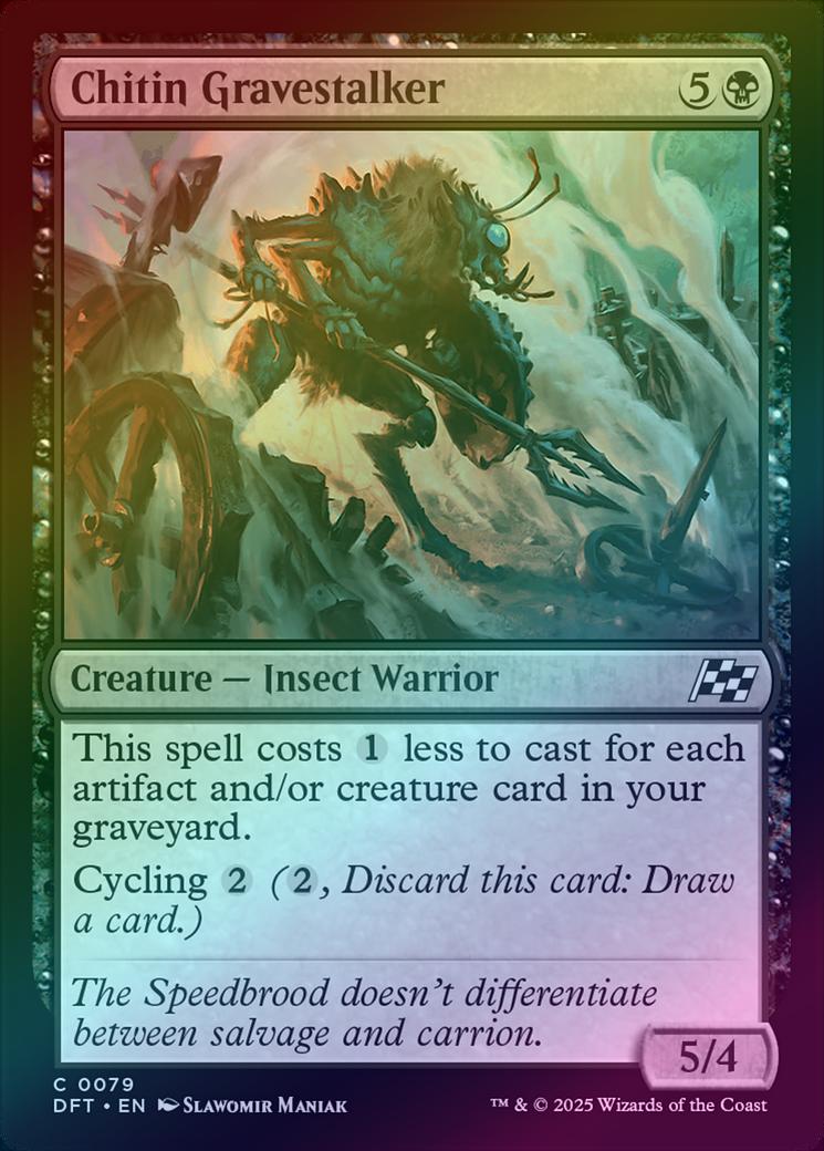 Chitin GravestalkerCasting Cost: Card Type: Creature - Insect WarriorPower/Toughness: 5/4Card Text: This spell costs less to cast for each artifact and/or creature card in your graveyard. Cycling (, Discard this card: Draw a card.)Flavour Text: The Speedbrood doesn't differentiate between salvage and carrion.Artist: Slawomir Maniak