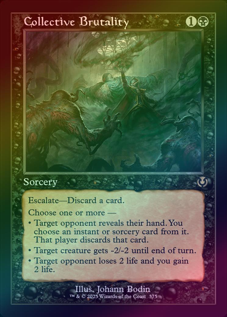 Collective BrutalityCasting Cost: Card Type: SorceryCard Text: Escalate-Discard a card. (Pay this cost for each mode chosen beyond the first.) Choose one or more - - Target opponent reveals their hand. You choose an instant or sorcery card from it. That player discards that card. - Target creature gets -2/-2 until end of turn. - Target opponent loses 2 life and you gain 2 life.Artist: Johann Bodin