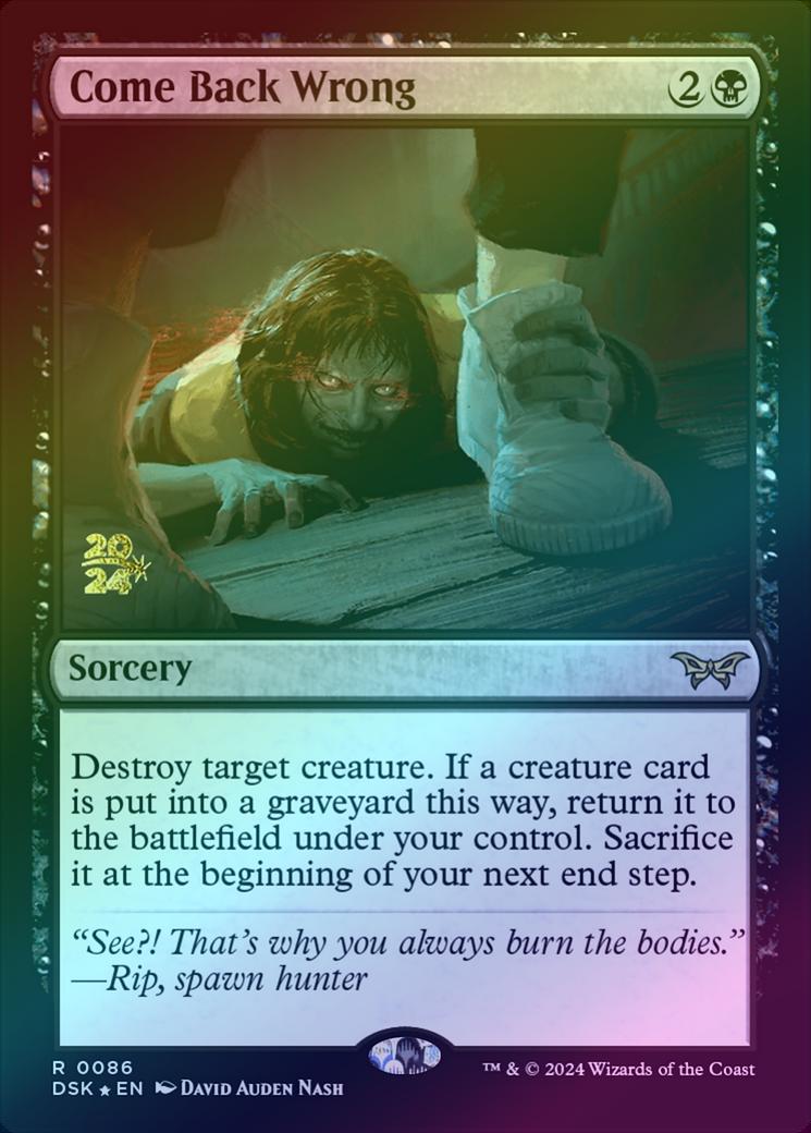 Come Back WrongCasting Cost: Card Type: SorceryCard Text: Destroy target creature. If a creature card is put into a graveyard this way, return it to the battlefield under your control. Sacrifice it at the beginning of your next end step.Flavour Text: "See?! That's why you always burn the bodies." -Rip, spawn hunterArtist: David Auden Nash