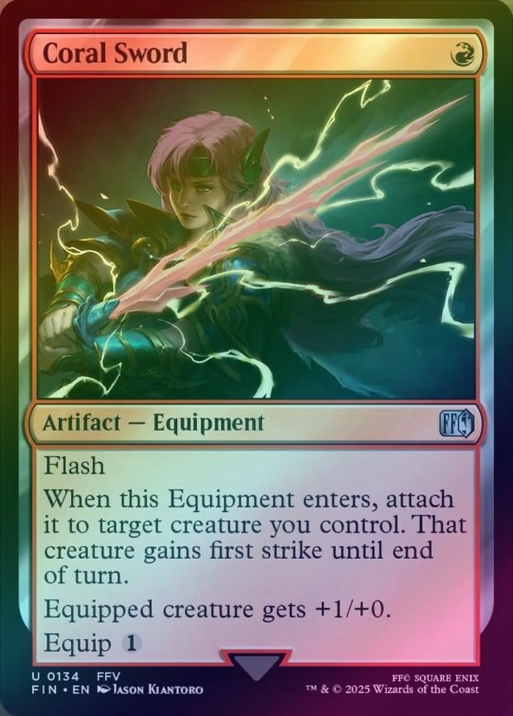 Coral SwordCasting Cost: Card Type: Artifact - EquipmentCard Text: Flash When this Equipment enters, attach it to target creature you control. That creature gains first strike until end of turn. Equipped creature gets +1/+0. Equip Artist: Jason Kiantoro
