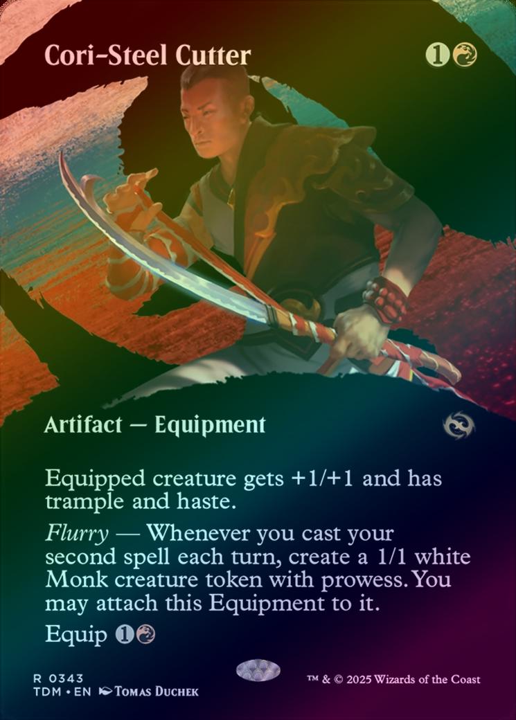 Cori-Steel CutterCasting Cost: Card Type: Artifact - EquipmentCard Text: Equipped creature gets +1/+1 and has trample and haste. Flurry - Whenever you cast your second spell each turn, create a 1/1 white Monk creature token with prowess. You may attach this Equipment to it. (Whenever you cast a noncreature spell, the token gets +1/+1 until end of turn.) Equip Artist: Tomas Duchek