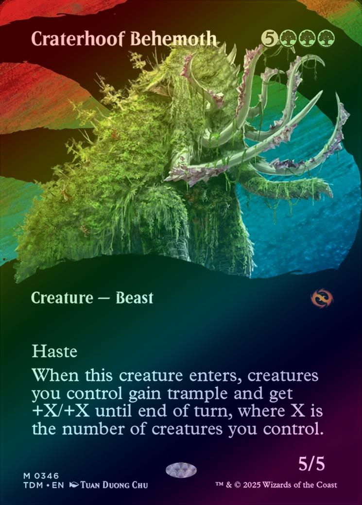 Craterhoof BehemothCasting Cost: Card Type: Creature - BeastPower/Toughness: 5/5Card Text: Haste When this creature enters, creatures you control gain trample and get +X/+X until end of turn, where X is the number of creatures you control.Artist: Tuan Duong Chu