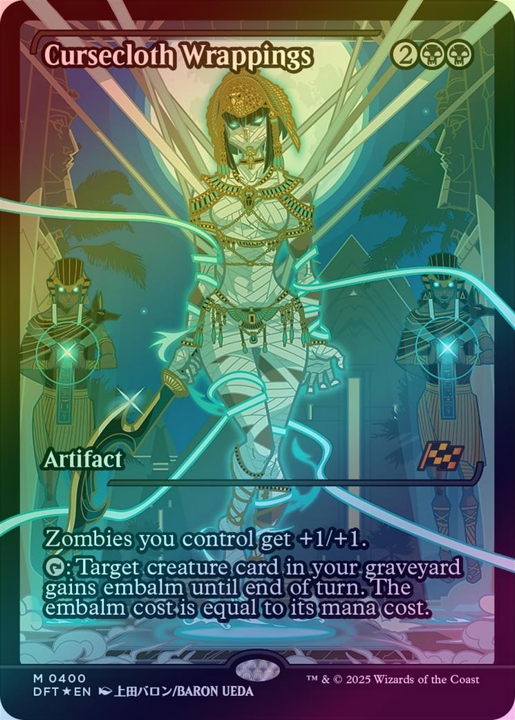 Cursecloth WrappingsCasting Cost: Card Type: ArtifactCard Text: Zombies you control get +1/+1. : Target creature card in your graveyard gains embalm until end of turn. The embalm cost is equal to its mana cost. (Exile that card and pay its embalm cost: Create a token that's a copy of it, except it's a white Zombie in addition to its other types and has no mana cost. Embalm only as a sorcery.)Artist: BARON UEDA