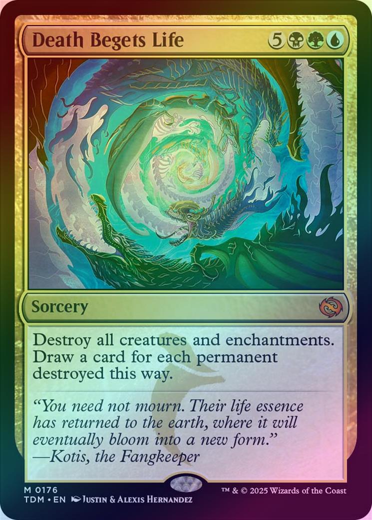 Death Begets LifeCasting Cost: Card Type: SorceryCard Text: Destroy all creatures and enchantments. Draw a card for each permanent destroyed this way.Flavour Text: "You need not mourn. Their life essence has returned to the earth, where it will eventually bloom into a new form." -Kotis, the FangkeeperArtist: Justin Hernandez & Alexis Hernandez